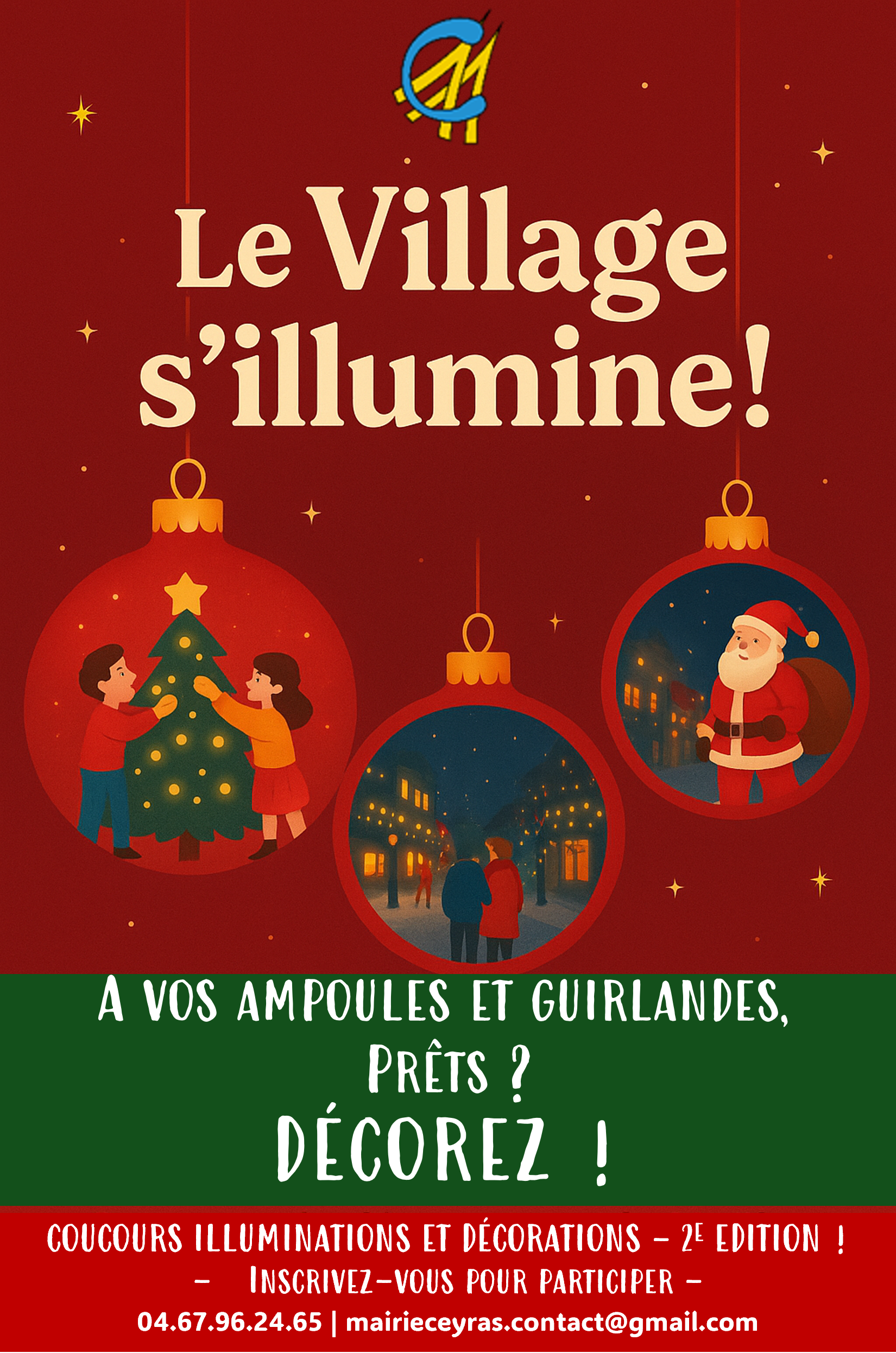Cette année encore, Ceyras se pare de mille feux pour les fêtes de fin d’année ! Venez partager la magie de Noël et contribuer à l’ambiance festive de notre village. 🎁🏡🎇 Deux concours sont proposés :